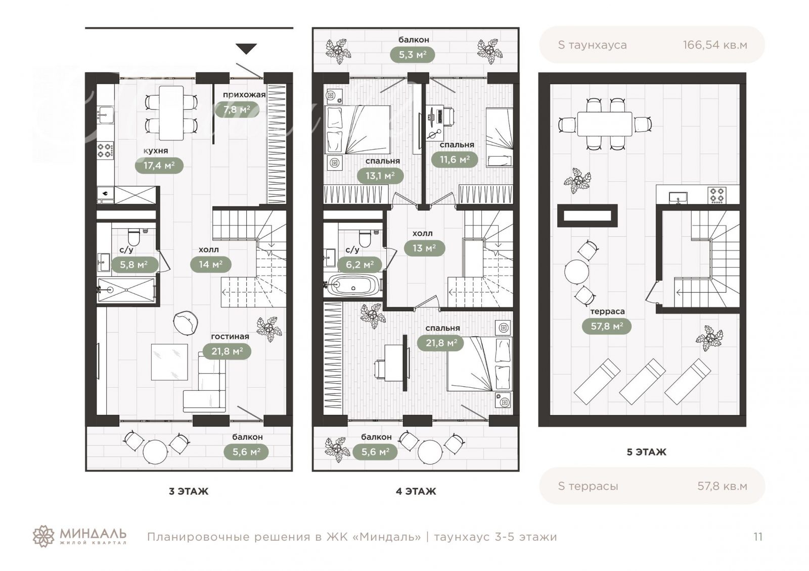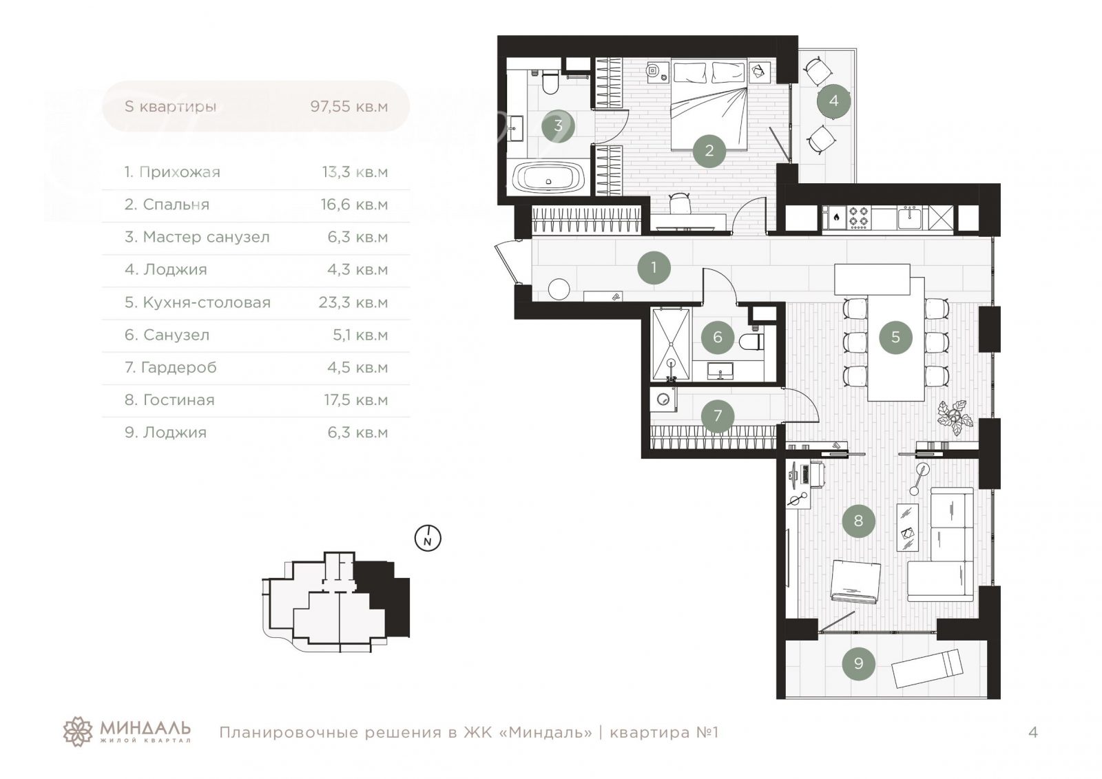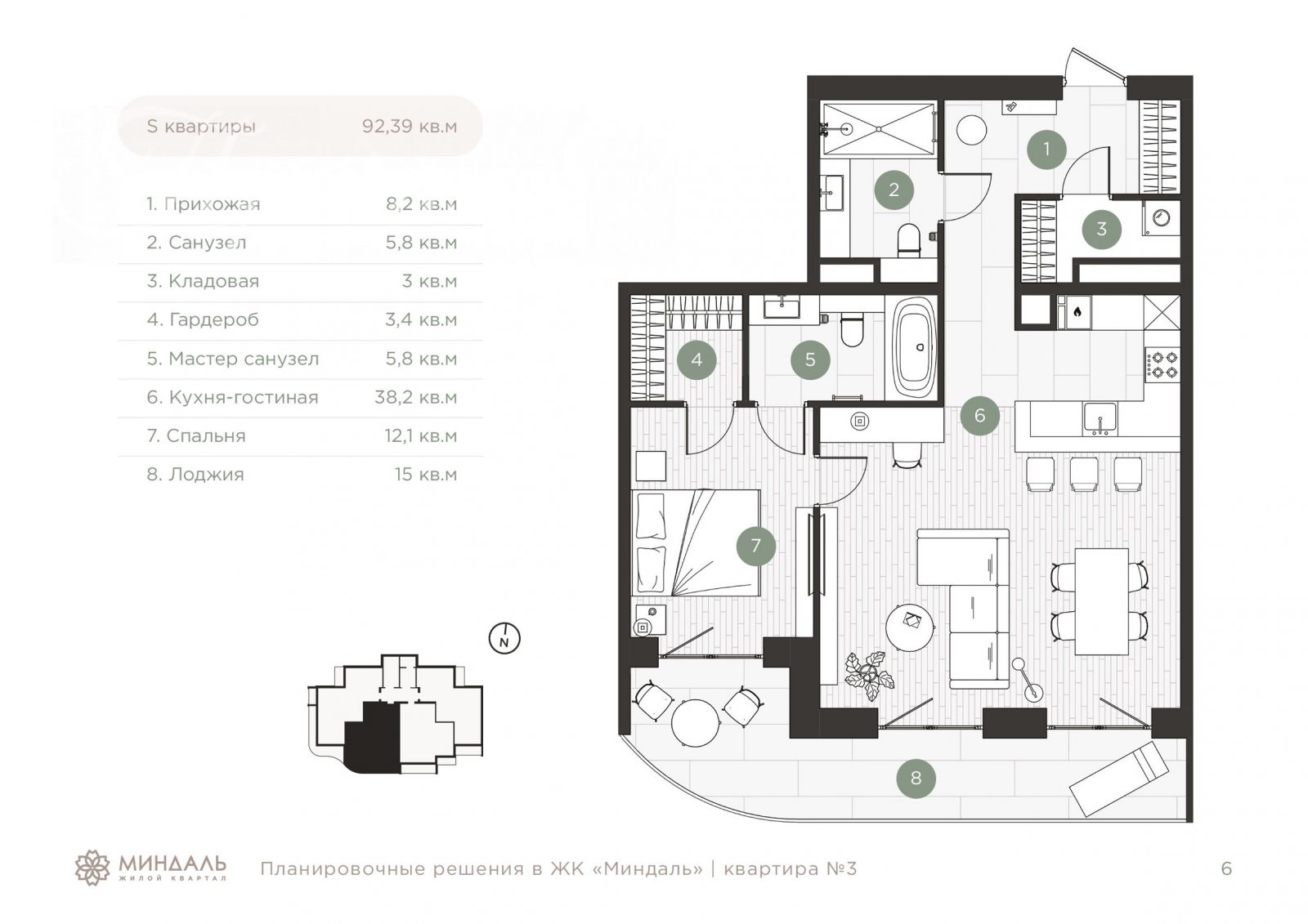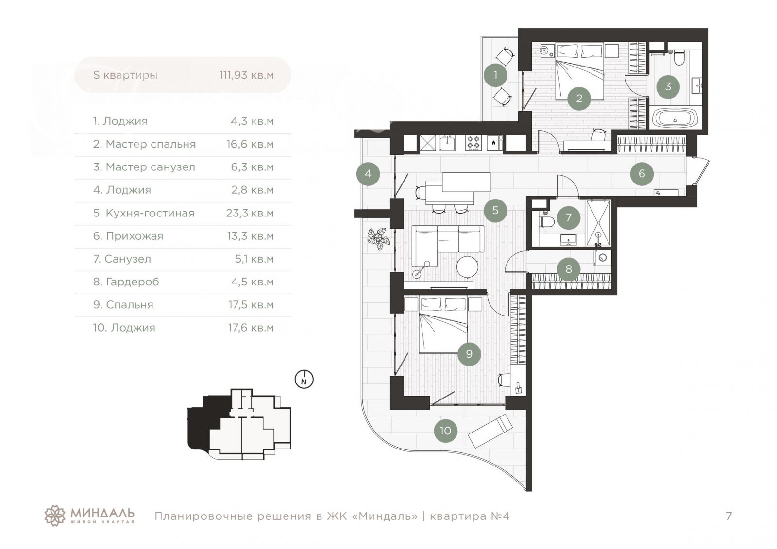 Трехкомнатная квартира в ЖК Миндаль. Включает — гостиную, 2 спальни, кухню, 2 с/у, 3 балкона.